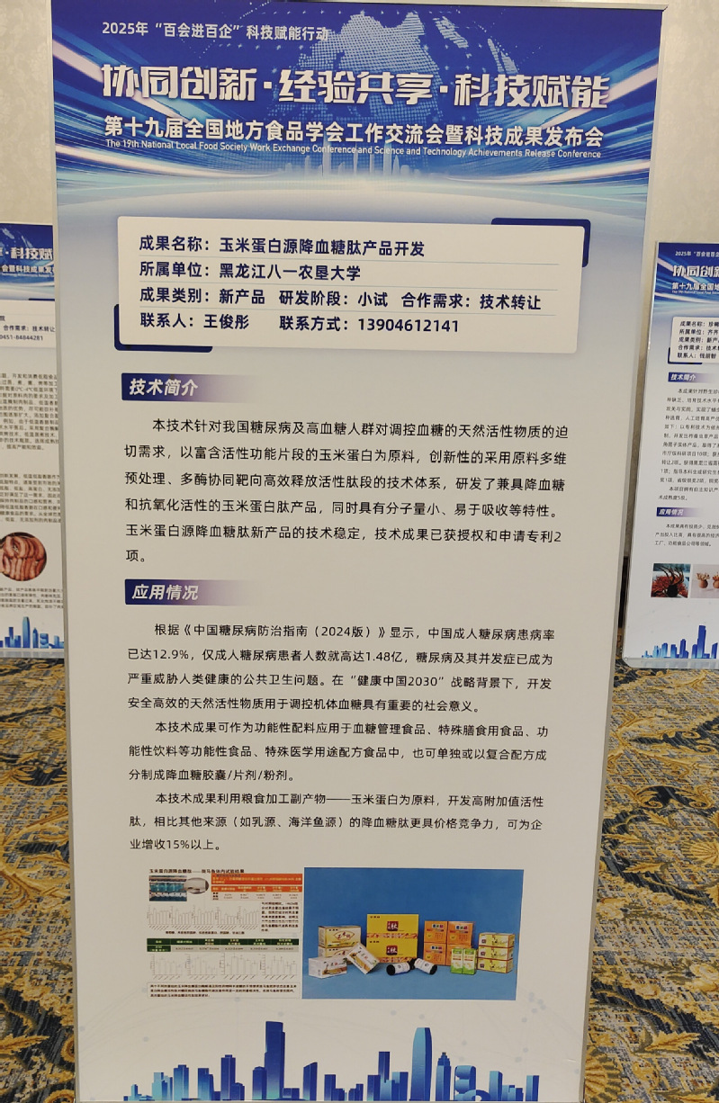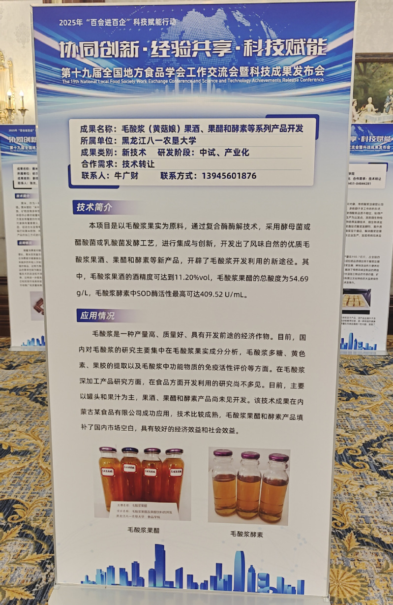 公司牛广财教授的“毛酸浆(黄菇娘)果酒、果醋和酵素等系列产品开发”成果,以及王俊彤老师的“玉米蛋白源降血糖肽产品开发”成果以墙报形式在会场展示。吸引了众多参会专家与企业代表驻足查阅、交流咨询,其技术应用价值与产业化潜力获得广泛认可,为后续开展学术合作与技术对接奠定了良好基础。